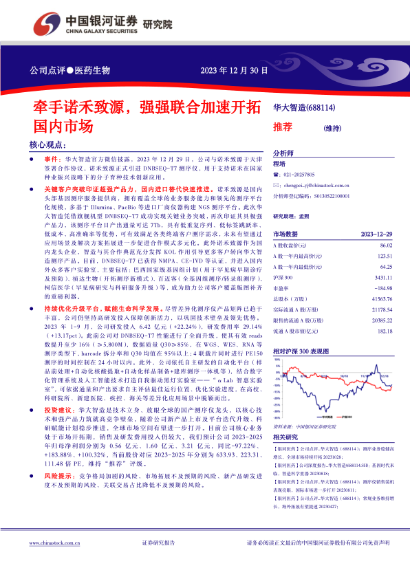 本报告分析了华大智造与诺禾致源合作的战略意义,指出该合作是华大智造产品力获得市场认可的重要标志,并加速了国产测序仪的进口替代进程。报告还强调了华大智造在技术研发和平台升级方面的持续投入,及其在自动化和数字化实验室建设方面的创新。最后,报告基于对公司未来盈利能力的预测,维持了对华大智造的“推荐”评级,并提示了相关风险。