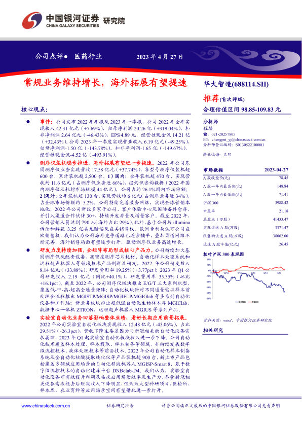 华大智造2022年全年实现收入42.31亿元,同比增长7.69%。归母净利润20.26亿元,同比增长319.04%,主要得益于与illumina诉讼和解获得的3.25亿美元赔偿。扣非净利润为2.64亿元,同比下降46.43%。经营性现金流14.21亿元,同比增长32.43%。 2023年一季度,公司营业收入为6.19亿元,同比下降49.25%,主要系自动化产品需求萎缩。归母净利润为-1.50亿元,同比下降143.78%,扣非净利润为-1.65亿元,同比下降149.67%,主要受营收结构改变导致毛利率下降7.5个百分点及研发费用增加影响。经营性现金流为-4.52亿元,同比下降493.91%。
