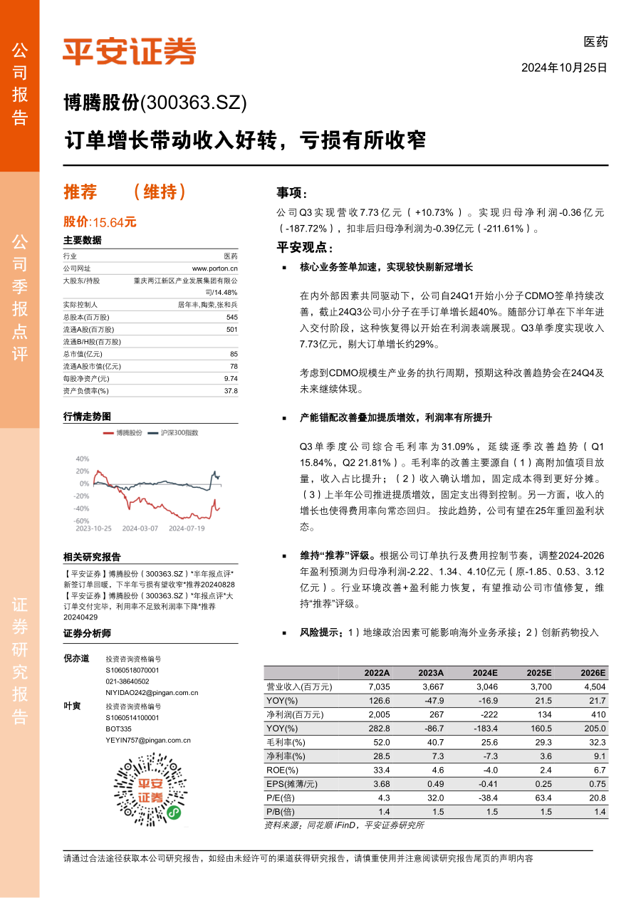 博腾股份在2024年第三季度通过核心业务签单加速和产能优化,实现了收入的显著增长和毛利率的提升,亏损有所收窄。平安证券维持对公司的“推荐”评级,并调整了未来几年的盈利预测,认为公司有望在2025年重回盈利状态。但同时也提示了地缘政治、研发和运营等方面的风险。总体来看,博腾股份正处于恢复增长的阶段,未来发展值得期待。