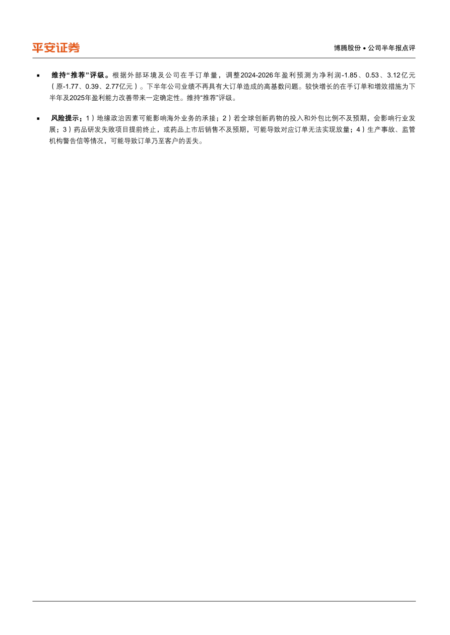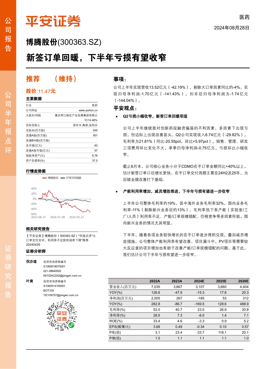 博腾股份上半年业绩受外部环境影响出现下滑,但Q2亏损已有所收窄,核心业务订单充足,下半年有望通过提升产能利用率和推进增效措施改善盈利能力。平安证券维持对公司“推荐”评级,但同时也提示了地缘政治、行业发展、研发风险和生产安全等潜在风险。
