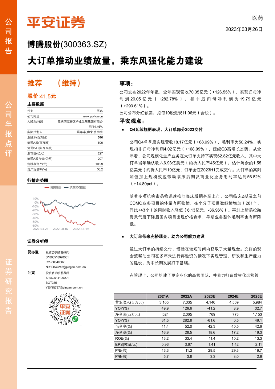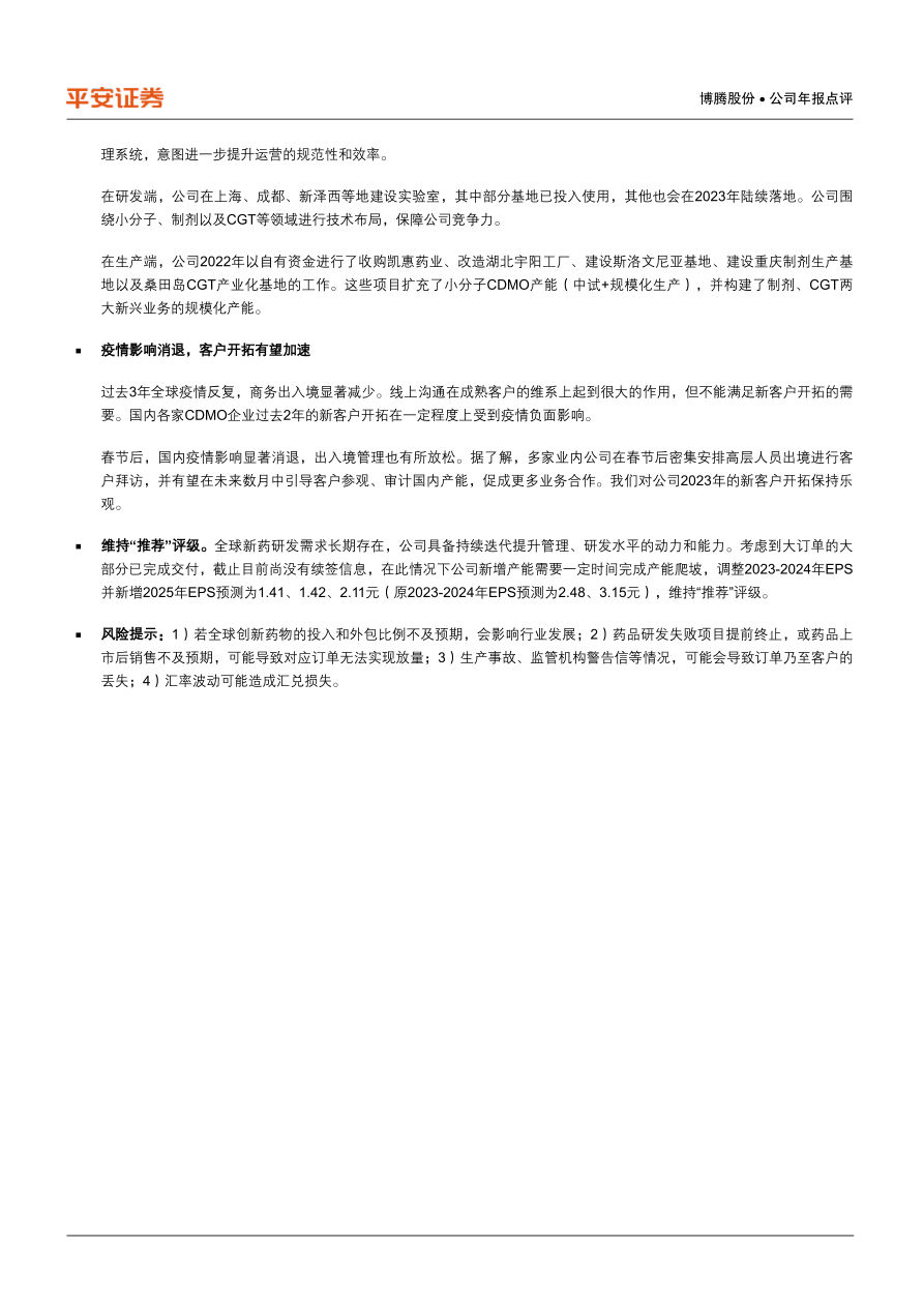 博腾股份2022年业绩受益于大订单的强劲推动,实现了营收和利润的大幅增长。公司积极利用充裕的现金流进行能力建设和产能扩张,为未来的发展奠定了坚实基础。随着疫情影响的消退,公司有望加速新客户的开拓,为业务增长带来新的机遇。尽管面临大订单交付完毕和产能爬坡的挑战,但公司具备持续提升管理和研发水平的动力,维持“推荐”评级。投资者应关注全球创新药物投入、药品研发进展、生产安全以及汇率波动等风险因素。