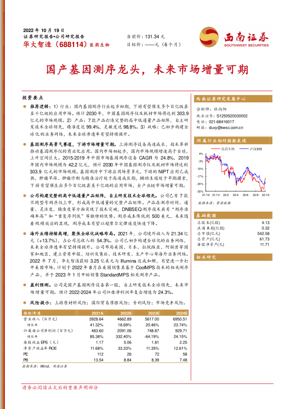 盈利预测。公司是国产基因测序设备第一股,自主研发技术全球领先,未来市场增量可期。预计2022-2024年公司归母净利润年复合增速为24.3%。