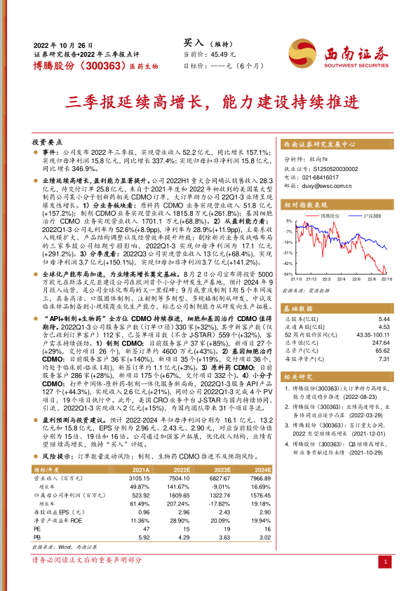 本报告分析了博腾股份(300363)2022年三季报,核心观点如下: