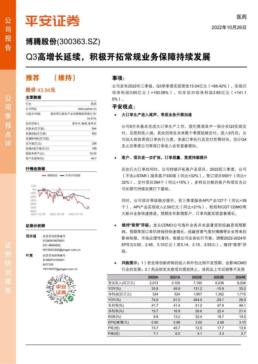 维持“推荐”评级:龙头CDMO公司海外业务并未显著受到投融资周期影响,预期常规订单仍将保持快速增长。根据公司业务执行节奏,调整2022-2024年EPS为3.50、2.48、3.15亿元(原3.14、3.15、3.55元),维持“推荐”评级。