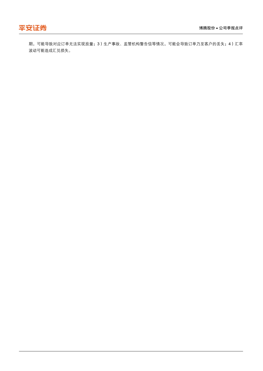 1)若全球创新药物的投入和外包比例不及预期,会影响CMO行业的发展;2)药品研发失败项目提前终止,或药品上市后销售不及预期,可能导致对应订单无法实现放量;3)生产事故、监管机构警告信等情况,可能会导致订单乃至客户的丢失;4)汇率波动可能造成汇兑损失。