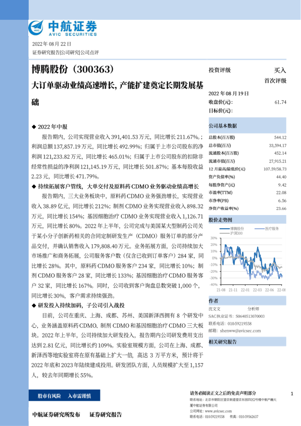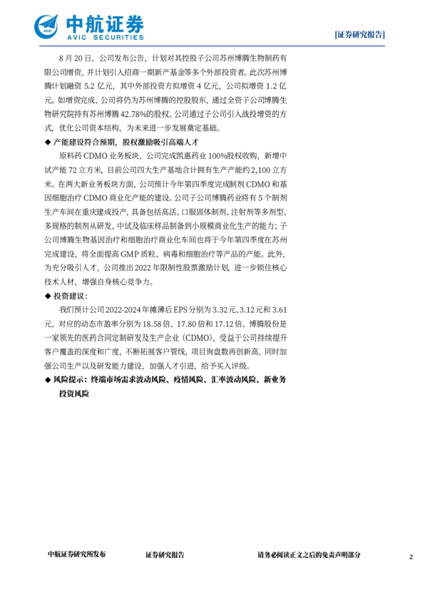 原料药CDMO业务板块,公司完成凯惠药业100%股权收购,新增中试产能72立方米,目前公司四大生产基地合计拥有生产产能约2,100立方米。在两大新业务板块方面,公司预计今年第四季度完成制剂CDMO和基因细胞治疗CDMO商业化产能的建设。公司子公司博腾药业将有5个制剂生产车间在重庆建成投产,具备包括高活、口服固体制剂、注射剂等多剂型、多规格的制剂从研发、中试及临床样品制备到小规模商业化生产的能力;子公司博腾生物基因治疗和细胞治疗商业化车间也将于今年第四季度在苏州完成建设,将全面提高GMP质粒、病毒和细胞治疗等产品的产能。此外,为充分吸引人才,公司推出2022年限制性股票激励计划,进一步锁住核心技术人材,增强自身核心竞争力。