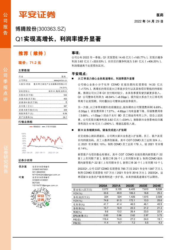 本报告分析了博腾股份(300363.SZ)2022年一季报,指出公司Q1营收和净利润均实现高速增长,主要得益于大订单的逐步交付和核心业务小分子化学CDMO的拓展。同时,公司整体毛利率显著提升,主要由于大订单毛利率高于预期以及公司整体运营效率的提升。