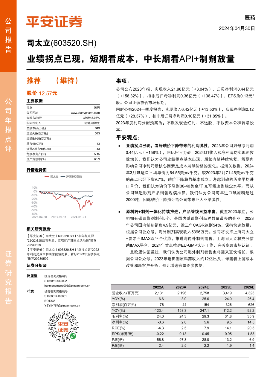 司太立业绩拐点已现,短期内受益于碘价下降带来的成本改善,中长期来看,海内外API+制剂的持续放量将驱动公司收入快速增长。维持“推荐”评级。