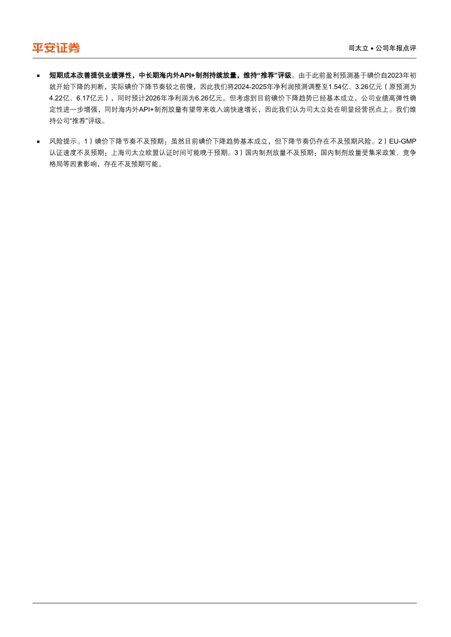 风险提示。1)碘价下降节奏不及预期:虽然目前碘价下降趋势基本成立,但下降节奏仍存在不及预期风险。2)EU-GMP认证速度不及预期:上海司太立欧盟认证时间可能晚于预期。3)国内制剂放量不及预期:国内制剂放量受集采政策、竞争格局等因素影响,存在不及预期可能。