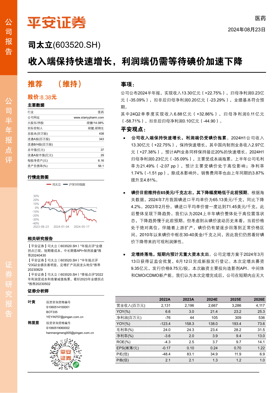 司太立2024年上半年收入端保持快速增长,但利润端受到高位碘价的拖累。公司定增落地,将有助于未来产能扩张和业务发展。尽管下调了盈利预测,但平安证券仍然看好公司长期发展,维持“推荐”评级。投资者需要关注碘价波动、EU-GMP认证进度以及国内制剂放量情况等风险因素。