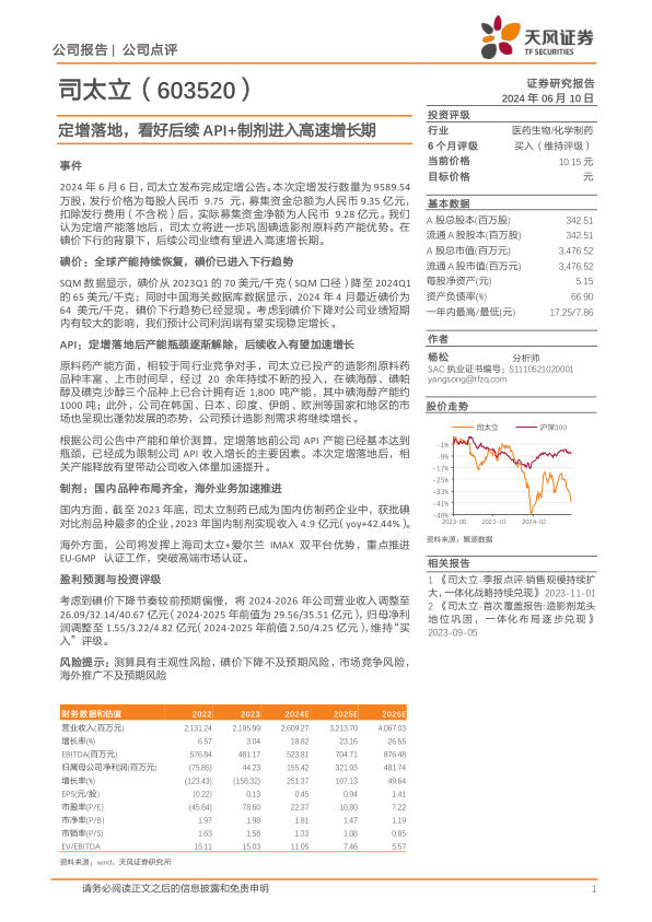 全球碘价自2023年第一季度起呈现下行趋势,从70美元/千克降至2024年4月的64美元/千克,为司太立的成本控制带来利好。结合定增带来的产能扩张,公司API和制剂业务有望进入高速增长期,预计2024-2026年归母净利润将分别达到1.55亿元、3.22亿元和4.82亿元,实现显著增长,驱动公司整体业绩迈向新台阶。