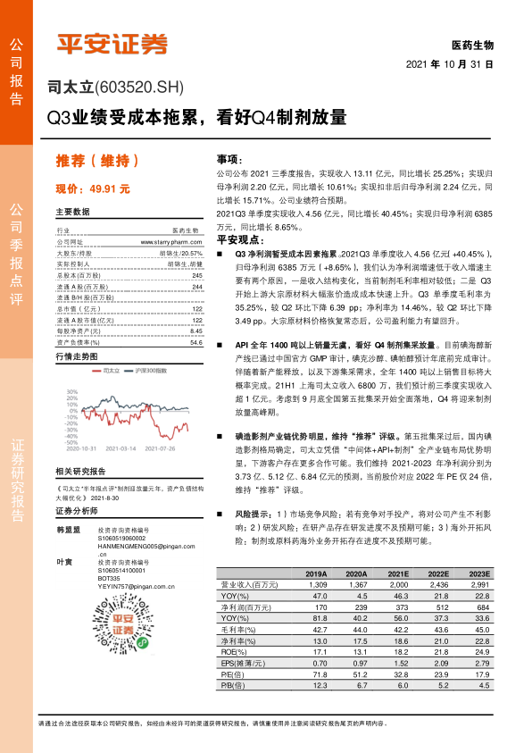 本报告对司太立2021年三季度业绩进行了分析,认为公司Q3业绩受到成本因素拖累,但API全年销量目标可期,看好Q4制剂集采放量。公司凭借全产业链优势,在碘造影剂市场格局中占据有利地位。维持公司盈利预测和“推荐”评级,但同时也提示了市场竞争、研发和海外开拓等风险。
