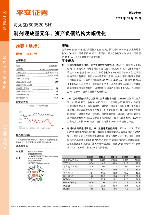 本报告分析了司太立2021年半年度业绩,指出公司业绩略低于预期但资产负债结构优化。制剂业务方面,受益于集采中标和与恒瑞医药的合作,上海司太立有望扭亏为盈。API业务方面,新增产能通过认证,预计全年销量将大幅增长。报告调整了盈利预测,但维持“推荐”评级,并提示了市场竞争、研发和海外开拓等风险。