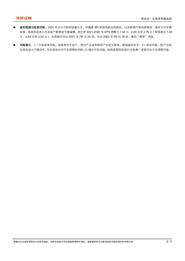风险提示:1)市场竞争风险:或竞争对手投产,将对产品竞争格局产生较大影响,影响盈利水平;2)研发风险:险产品研发具有较大不确定性,存在获批时间不及预期的风险;3)海外开拓风险:制剂或原料药海外业务推广进度存在不及预期可能。