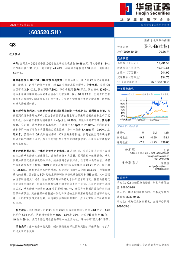 爆炸事件拉低Q3业绩,Q4有望加速恢复:公司仙居工厂在7月27日发生爆炸事故,造成8、9两月的停产整顿,对Q3业绩造成较大影响。分季度看,公司Q3实现营收3.24亿元,同比下降7.30%;归母净利润5876万元,同比增长32.62%。总体来看爆炸事故对公司Q3业绩小于此前预期;截止10月29日,公司工厂已基本恢复正常运营。随着仙居工厂的恢复,公司将开始陆续恢复供应碘海醇、碘帕醇和碘克沙醇原料药。