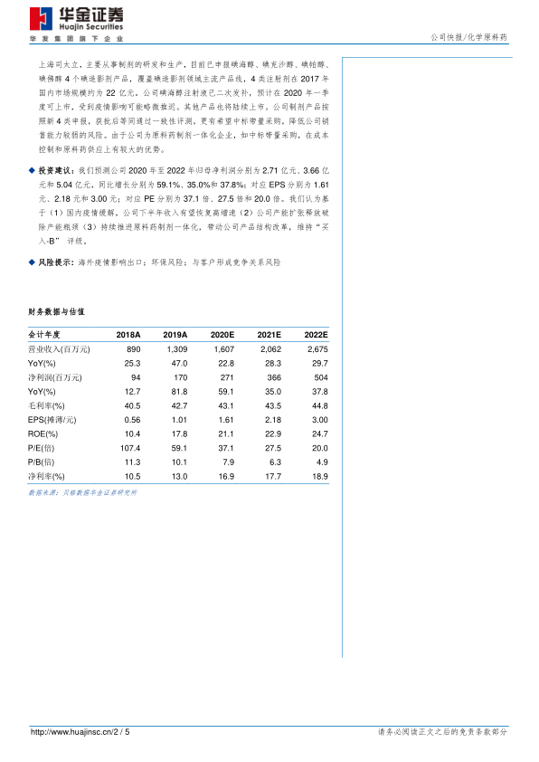 华金证券维持司太立“买入-B”评级。预测公司2020年至2022年归母净利润分别为2.71亿元、3.66亿元和5.04亿元,同比增长分别为59.1%、35.0%和37.8%。对应EPS分别为1.61元、2.18元和3.00元;对应PE分别为37.1倍、27.5倍和20.0倍。