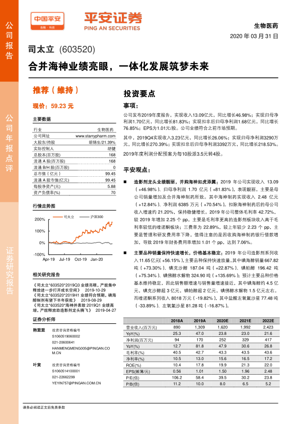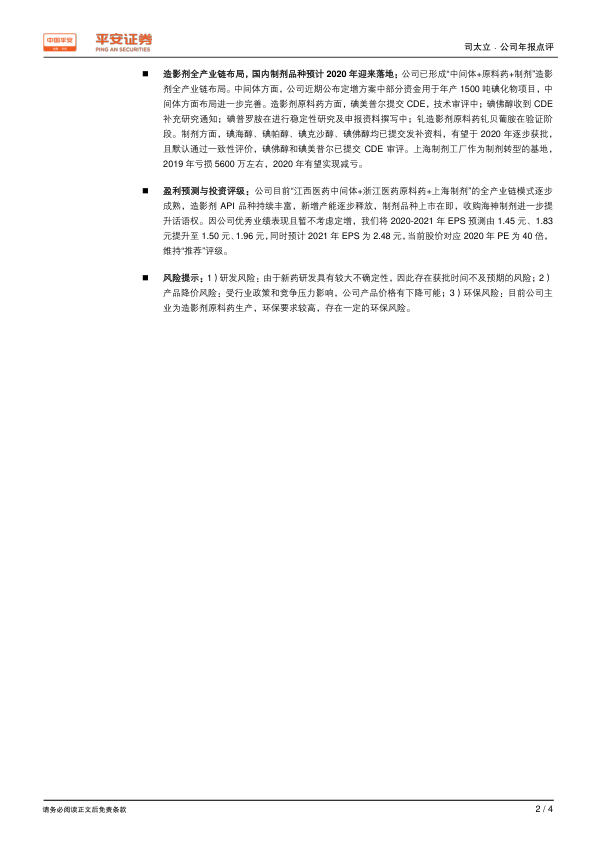 司太立2019年业绩表现亮眼,造影剂业务增长强劲,合并海神制药带来业绩增量。公司通过全产业链布局,以及制剂品种的逐步获批,有望在未来实现持续增长。维持“推荐”评级,但需关注研发风险、产品降价风险和环保风险。