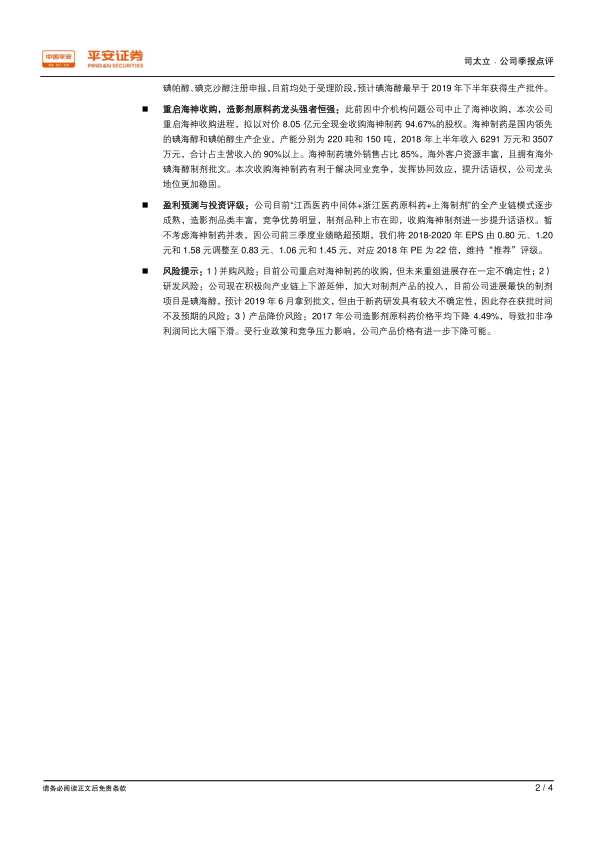 1)并购风险:目前公司重启对海神制药的收购,但未来重组进展存在一定不确定性;2)研发风险:公司现在积极向产业链上下游延伸,加大对制剂产品的投入,目前公司进展最快的制剂项目是碘海醇,预计2019年6月拿到批文,但由于新药研发具有较大不确定性,因此存在获批时间不及预期的风险;3)产品降价风险:2017 年公司造影剂原料药价格平均下降 4.49%,导致扣非净利润同比大幅下滑。受行业政策和竞争压力影响,公司产品价格有进一步下降可能。