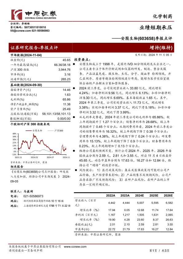 安图生物作为国内体外诊断(IVD)领域的领先企业,在2024年前三季度实现了营业收入和归母净利润的同比增长,显示出稳健的整体增长态势。然而,第三季度归母净利润出现同比下滑,表明公司短期内面临一定的业绩压力。尽管如此,分析师维持了“增持”的投资评级,并基于对未来盈利能力的预测,认为公司具备持续增长的潜力。