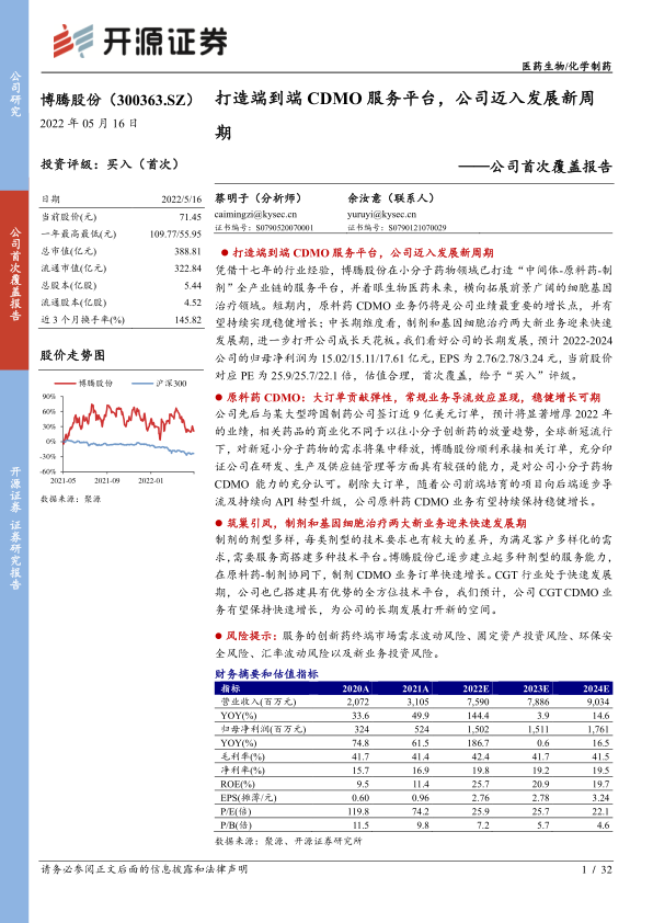 凭借十七年的行业经验,博腾股份在小分子药物领域已打造“中间体-原料药-制剂”全产业链的服务平台,并着眼生物医药未来,横向拓展前景广阔的细胞基因治疗领域。短期内, 原料药 CDMO 业务仍将是公司业绩最重要的增长点,并有望持续实现稳健增长;中长期维度看, 制剂和基因细胞治疗两大新业务迎来快速发展期, 进一步打开公司成长天花板。 我们看好公司的长期发展,预计 2022-2024公司的归母净利润为 15.02/15.11/17.61 亿元, EPS 为 2.76/2.78/3.24 元,当前股价对应 PE 为 25.9/25.7/22.1 倍, 估值合理,首次覆盖,给予“买入”评级。