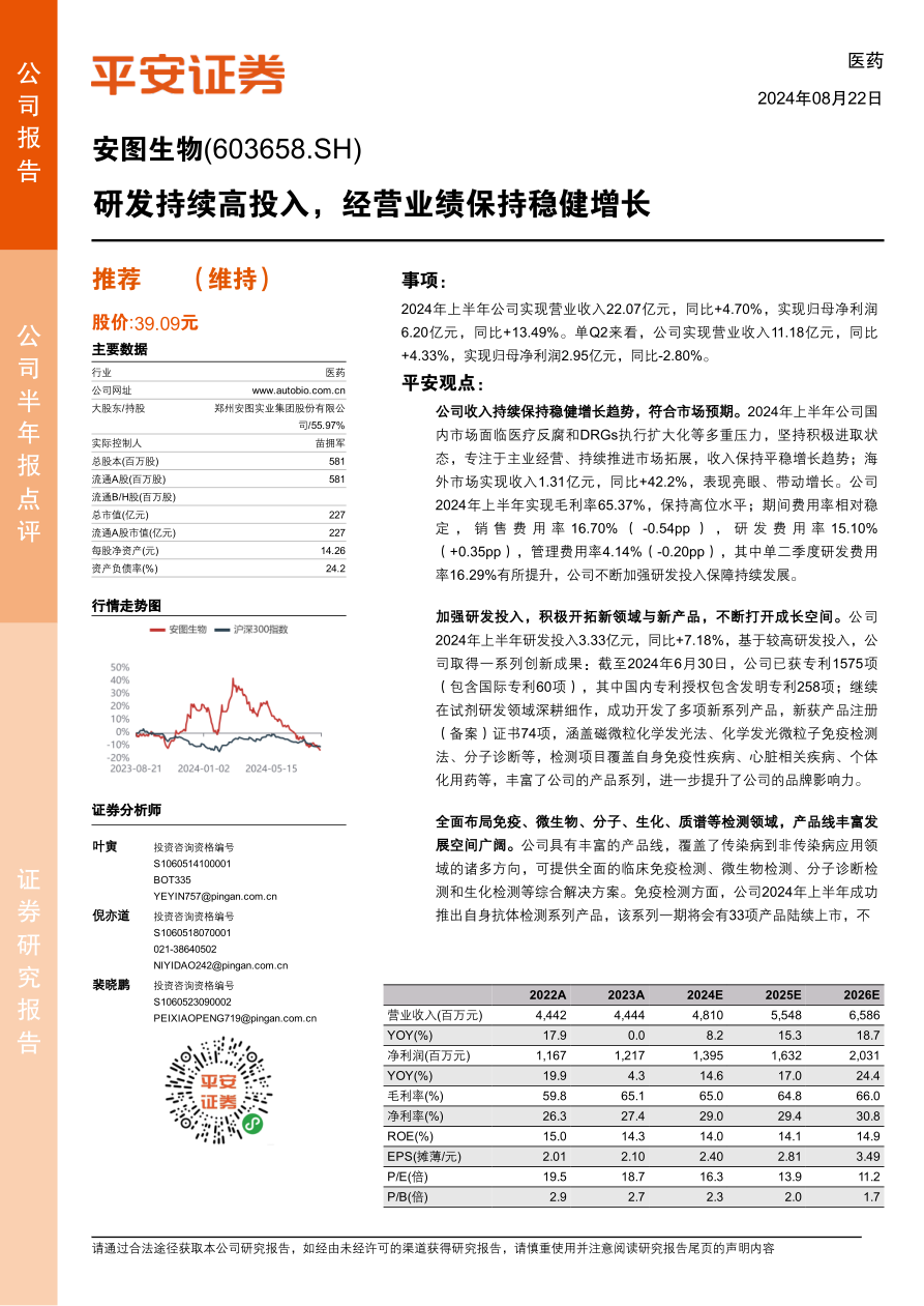 平安证券维持对安图生物的“推荐”评级,并根据中报和国内政策变化调整了2024-2026年的EPS预测,持续看好公司在体外诊断领域的长期发展。