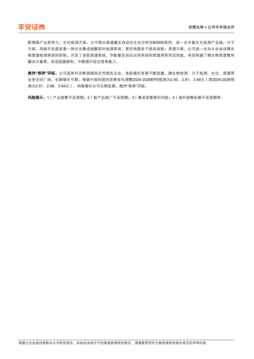 安图生物2024年上半年业绩稳健增长,海外市场表现突出,研发投入持续加大,新产品不断推出,产品线日益丰富。平安证券维持“推荐”评级,看好公司在体外诊断领域的长期发展。但同时也提示了产品销售、新产品推广、集采政策以及海外销售等方面的风险。