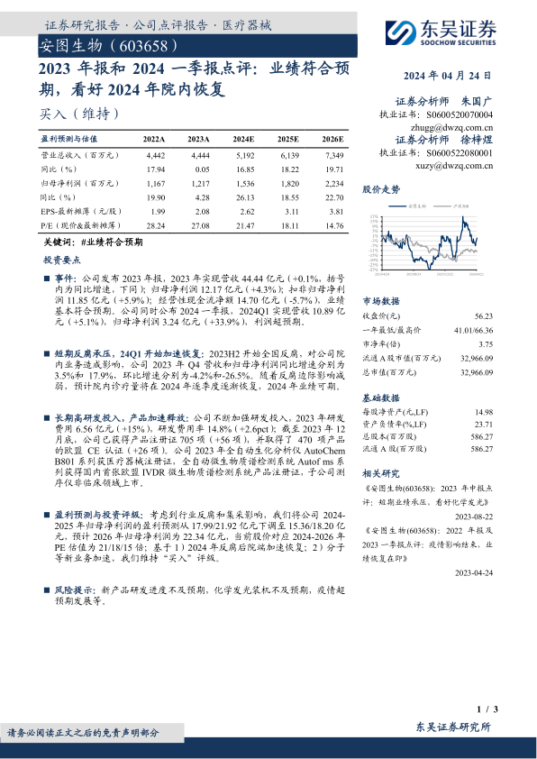 考虑到行业反腐和集中采购可能带来的影响,东吴证券对安图生物2024-2025年的归母净利润预测进行了调整,分别从17.99亿元和21.92亿元下调至15.36亿元和18.20亿元。同时,预计2026年归母净利润将达到22.34亿元。基于当前股价,公司2024-2026年的预测市盈率(P/E)分别为21倍、18倍和15倍。 尽管盈利预测有所调整,但分析师维持了对安图生物的“买入”评级。这一评级主要基于两点:一是预计2024年反腐后院端业务将加速恢复;二是分子诊断等新业务的加速发展将为公司带来新的增长动力。