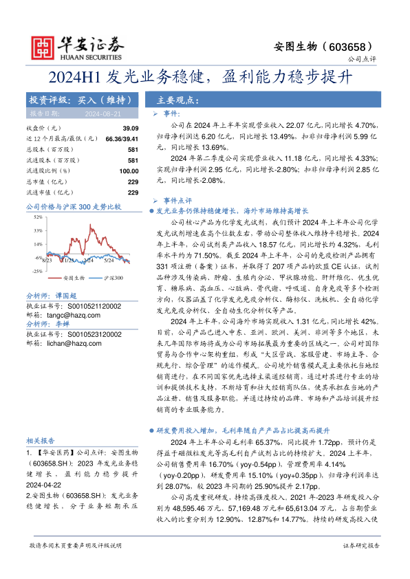本报告对安图生物2024年上半年的业绩进行了分析,核心观点如下: