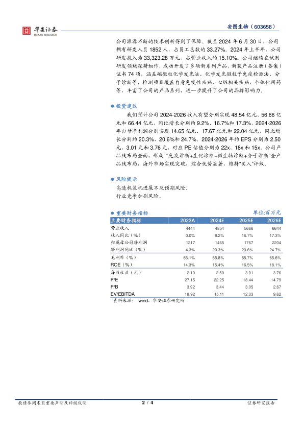 我们预计公司2024-2026收入有望分别实现48.54亿元、56.66亿元和66.44亿元,同比增长分别约9.2%、16.7%和17.3%,2024-2026年归母净利润分别实现14.65亿元、17.67亿元和22.04亿元,同比增长分别约20.3%、20.6%和24.7%。2024-2026年的EPS分别为2.50元、3.01元和3.76元,对应PE估值分别为22x、18x和15x。公司产品线布局全面,形成“免疫诊断+生化诊断+微生物诊断+分子诊断”全产品线布局,海外市场实现突破,综合优势显著,维持“买入”评级。