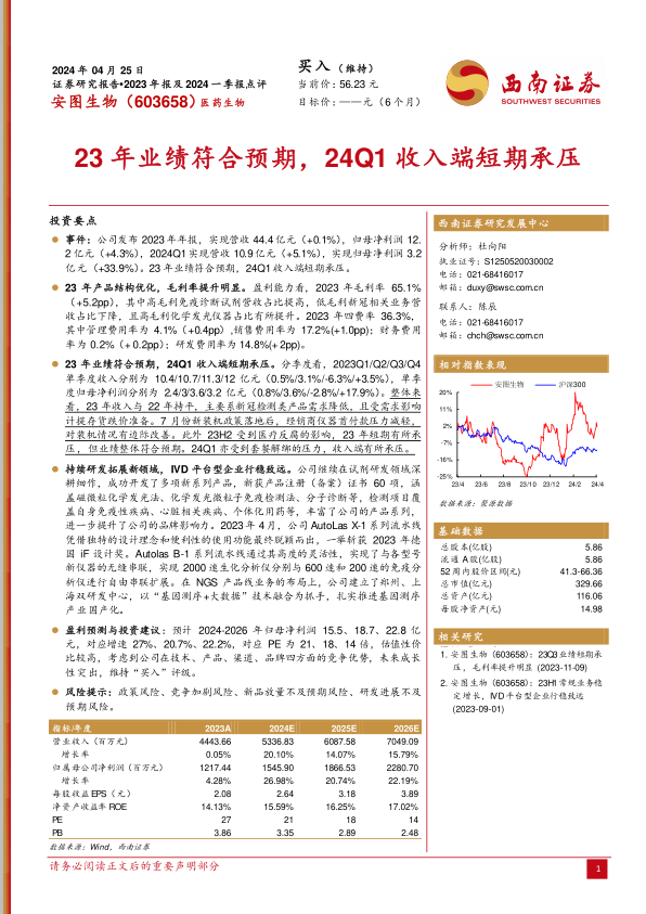 本报告对安图生物(603658)2023年年报及2024年一季报进行了深度分析,核心观点如下: