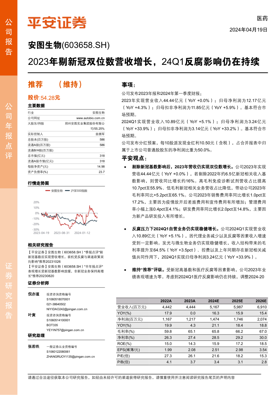 本报告分析了安图生物2023年年报和2024年第一季度财报,指出公司在剔除新冠相关收入后,营收实现双位数增长,高毛利产品占比提升带动盈利能力增强。尽管受到医疗反腐等因素影响,公司Q1自营业务仍保持稳健增长。报告调整了盈利预测,维持“推荐”评级,并提示了产品销售、新品审批和集采降价等风险。