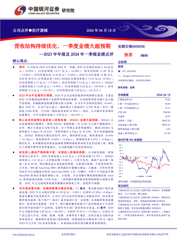 本报告对安图生物(603658)2023年年报及2024年一季报进行了深入分析,核心观点如下: