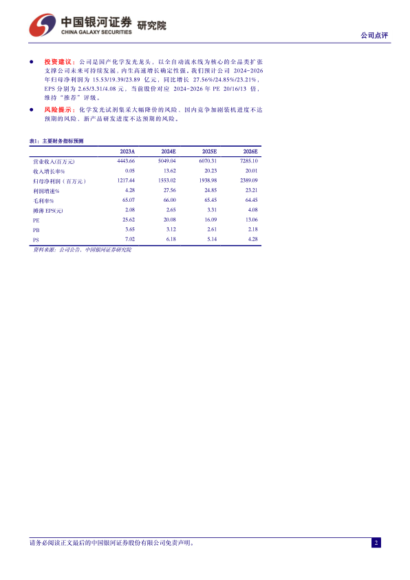 投资建议:公司是国产化学发光龙头,以全自动流水线为核心的全品类扩张支撑公司未来可持续发展,内生高速增长确定性强。我们预计公司2024-2026年归母净利润为15.53/19.39/23.89亿元,同比增长27.56%/24.85%/23.21%,EPS分别为2.65/3.31/4.08元,当前股价对应2024-2026年PE20/16/13倍,维持“推荐”评级。