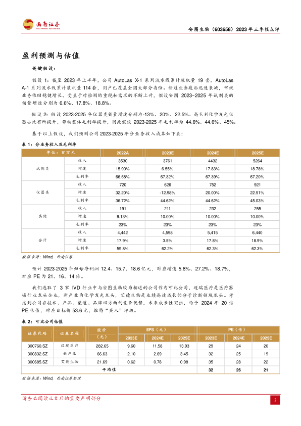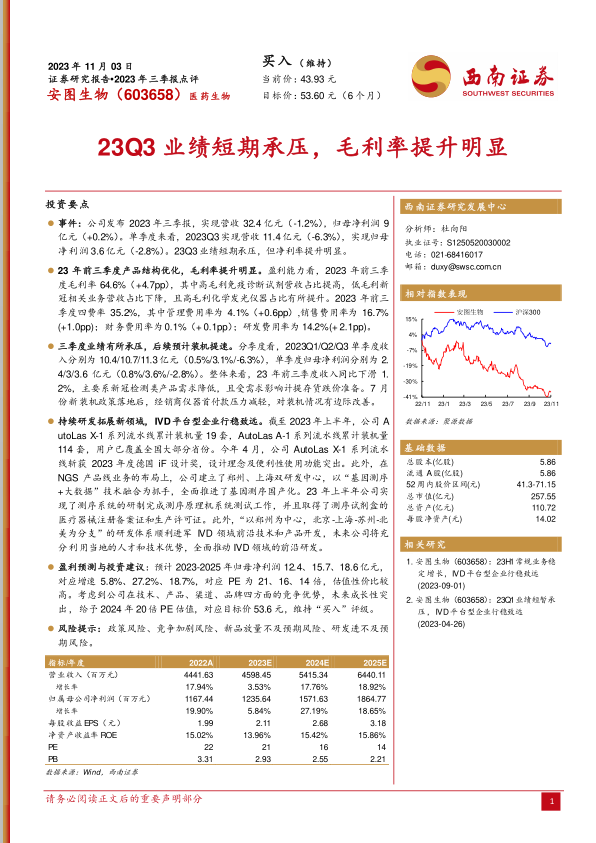 本报告分析了安图生物2023年三季报,指出公司业绩短期承压,但毛利率提升明显,盈利能力增强。公司在IVD领域持续创新,NGS产品线布局完善,未来发展潜力巨大。维持对公司“买入”评级,并给出了相应的盈利预测和估值建议。