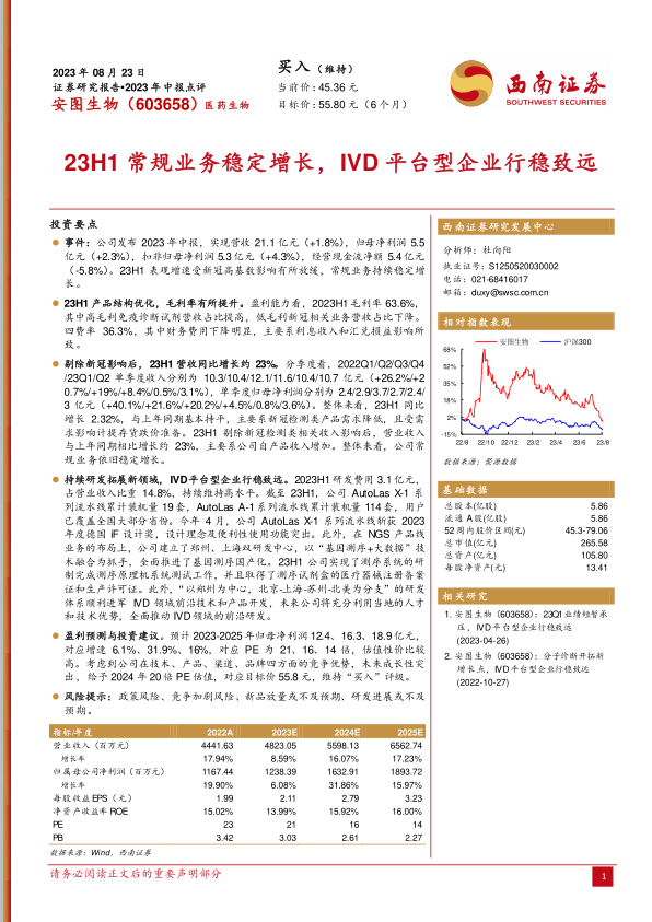 安图生物2023年上半年业绩在新冠业务高基数影响下仍展现出常规业务的稳健增长,剔除新冠影响后营收同比增长约23%。公司通过产品结构优化提升了毛利率,并持续高强度投入研发,在自动化流水线和基因测序等前沿领域取得显著进展,稳步构建IVD平台型企业优势。基于对公司未来成长性的判断,报告预测2023-2025年归母净利润将持续增长,并维持“买入”评级,目标价55.8元,但同时提示了政策、竞争、新品放量及研发进展等潜在风险。