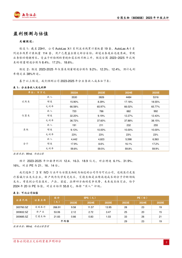 报告预计安图生物2023-2025年归母净利润分别为12.4亿元、16.3亿元和18.9亿元,对应增速分别为6.1%、31.9%和16%。对应的PE估值分别为21倍、16倍和14倍,显示出较高的估值性价比。基于关键假设,试剂类产品2023-2025年销量增速预计分别为8.39%、17.18%和18.55%,仪器类产品销量增速预计分别为9.19%、12.27%和12.43%。