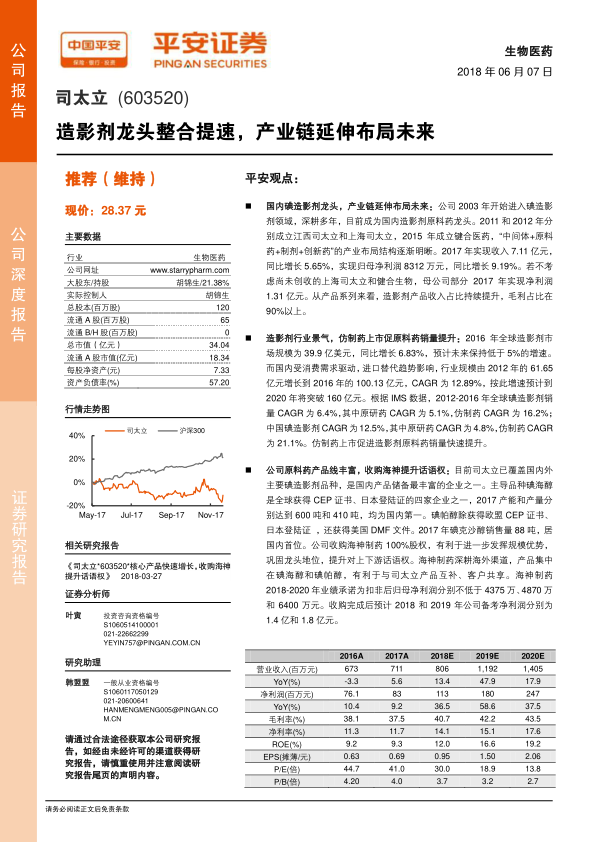 司太立自2003年进入碘造影剂领域以来,已发展成为国内造影剂原料药龙头。公司通过成立江西司太立、上海司太立和键合医药,逐步构建了“中间体+原料药+制剂+创新药”的产业布局。2017年,公司实现收入7.11亿元,同比增长5.65%;归母净利润8312万元,同比增长9.19%。若不考虑尚未创收的上海司太立和健合生物,母公司部分2017年实现净利润1.31亿元,复合年增长率(CAGR)高达27.35%。