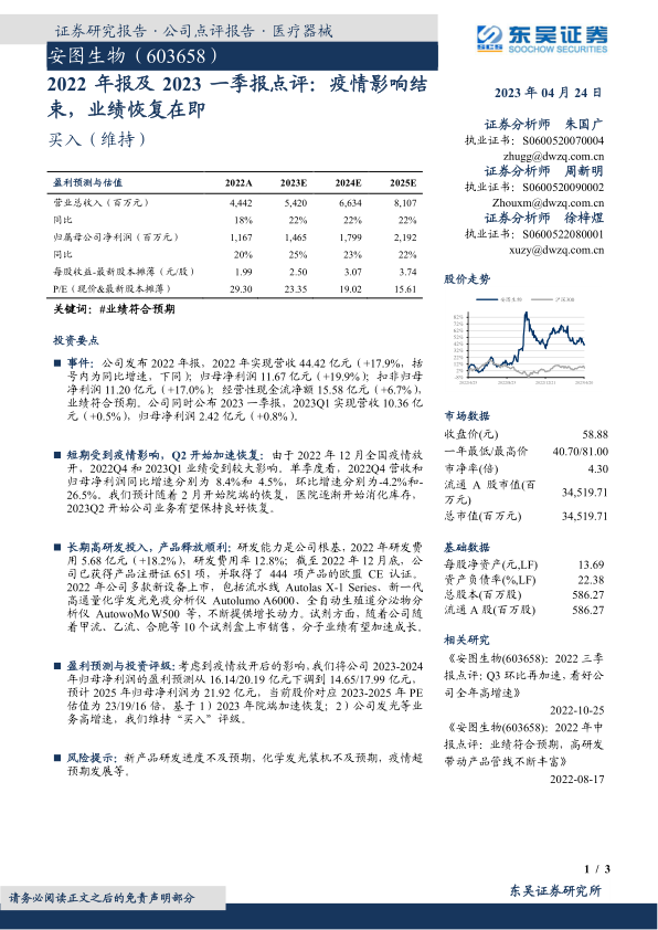 本报告对安图生物2022年报及2023一季报进行了点评,认为公司短期业绩受疫情影响,但长期来看,高研发投入和新产品上市将驱动业绩增长。报告下调了公司2023-2024年盈利预测,但维持“买入”评级,并提示了新产品研发、装机量和疫情发展等风险。