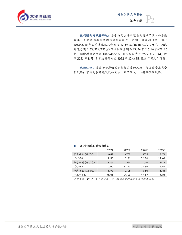 盈利预测与投资评级:基于公司去年新冠检测类产品收入的基数较高、而今年该类业务的销售金额减少,我们下调盈利预测,预计2023-2025年公司营业收入分别为47.89亿/58.55亿/71.78亿,同比增速分别为8%/22%/23%;归母净利润分别为13.24亿/16.40亿/20.15亿,同比增速分别为13%/24%/23%;EPS分别为2.26/2.80/3.44,按照2023年8月17日收盘价对应2023年22倍PE。维持“买入”评级。