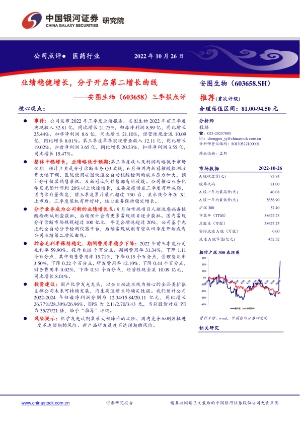 安图生物在2022年前三季度实现了稳健的业绩增长,尽管短期内分子诊断业务受到新冠核酸检测收费调整的影响,但公司核心的化学发光业务预计将恢复强劲增长。更重要的是,随着常规分子诊断试剂的获批和全自动检测平台的推广,分子业务有望成为公司新的业绩增长引擎,开启第二增长曲线。公司财务状况健康,毛利率稳定,费用率持续优化,经营性现金流表现良好。分析师基于对公司未来增长潜力的信心,给予“推荐”评级,并预测未来几年净利润将保持高速增长。同时,报告也客观指出了集采降价、市场竞争和新产品研发等方面的潜在风险,提示投资者关注。