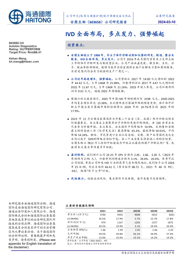 盈利预测。我们预计公司23-25年EPS分别为2.05、2.66、3.20元(2023年原预测为2.79元),归母净利润增速分别为3.1%、29.4%、20.4%,参考可比公司估值,考虑公司所处IVD行业的高景气度和领先地位,我们给予公司2024年25倍PE,对应目标价66.41元(原目标价68.72元,2021年40倍PE),-3%),维持“优于大市”评级。