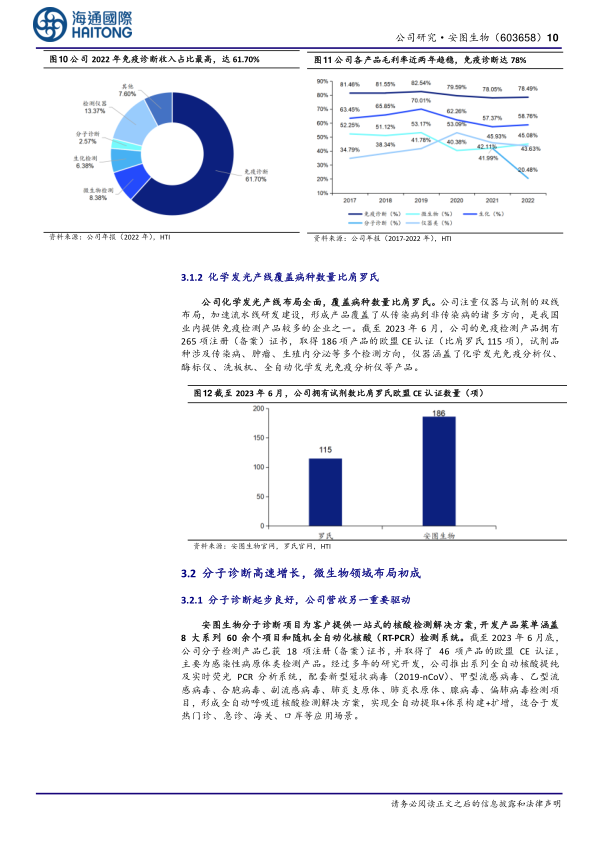 安图生物的化学发光业务起步历史久远,技术积累扎实,已发展成为国内本土化学发光领域的领军企业之一。公司持续投入技术升级,专注于磁微粒化学发光免疫检测技术,并于2013年至2022年间陆续推出中低高速全自动化学发光分析仪及全自动生免流水线。公司现已获得153项磁微粒化学发光诊断产品的注册(备案)证书。2022年,公司免疫诊断收入占比高达61.70%,毛利率维持在80%左右,是公司核心收入来源和业绩增长的“中流砥柱”。截至2023年6月,公司免疫检测产品拥有265项注册(备案)证书,并取得了186项欧盟CE认证,覆盖病种数量比肩罗氏。