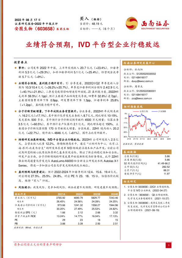 安图生物2022年中报显示业绩符合预期,盈利能力稳中有升。分子诊断业务贡献增量,下半年试剂业务有望提升。公司持续研发拓展新领域,作为IVD平台型企业,未来发展值得期待。维持“买入”评级,但需关注政策、竞争、新品放量和研发进展等风险。