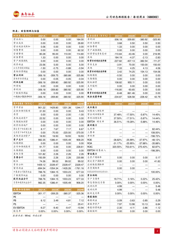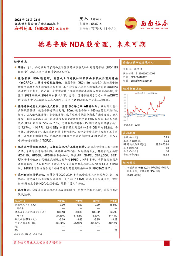 盈利预测与投资建议。预计公司2022-2024年实现营业收入分别约为0、0、1.6亿元。考虑海创药业研发实力强劲,氘代和PROTAC技术平台实力出众,首款创新药德恩鲁胺NDA已获受理,维持“买入”评级。