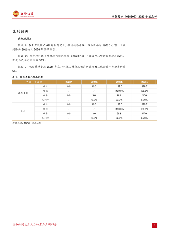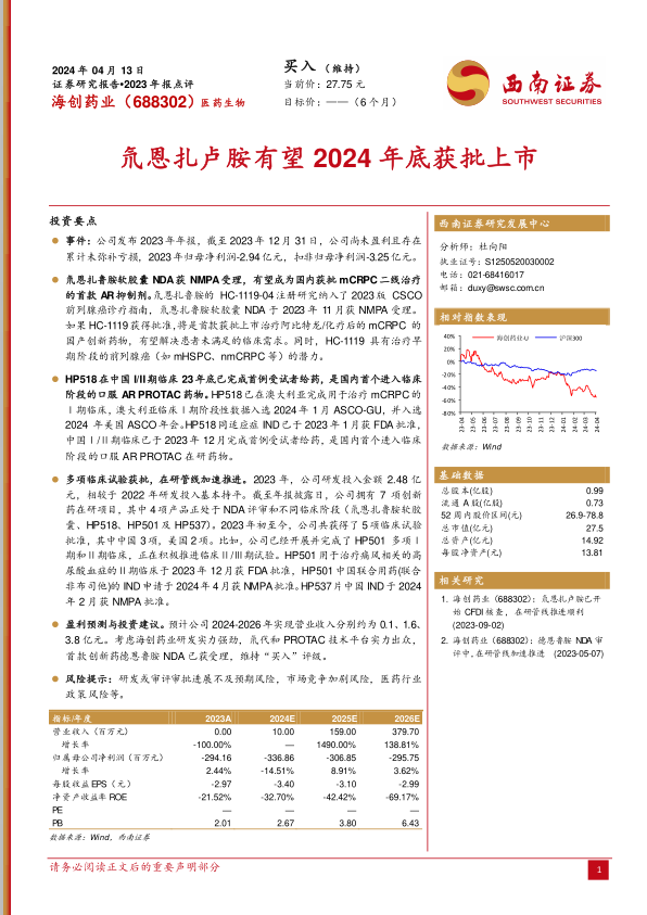 海创药业2023年报显示公司目前仍处于亏损状态,但研发管线进展顺利,尤其是氘恩扎卢胺有望在2024年底获批上市,HP518的临床试验也在加速推进。考虑到公司在氘代和PROTAC技术平台上的优势,以及首款创新药的潜力,西南证券维持对海创药业的“买入”评级,但同时也提示了研发风险、市场竞争风险和政策风险。