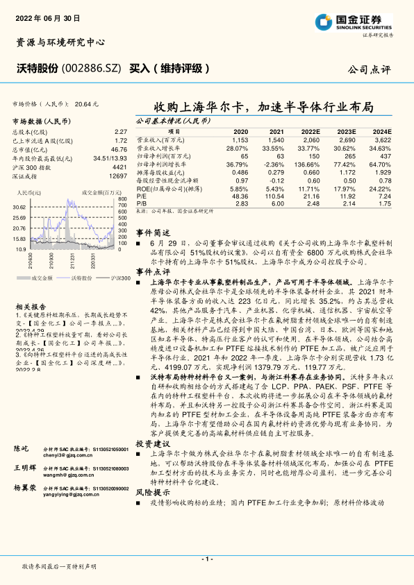 上海华尔卡做为株式会社华尔卡在氟树脂素材领域全球唯一的自有制造基地,可以帮助沃特股份在半导体装备材料领域深化布局,加强公司在PTFE加工型材方面的技术与业务实力,同时也能增厚公司盈利,进一步完善公司特种材料平台化建设。