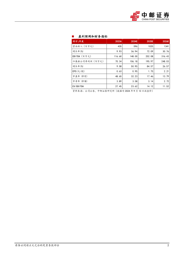 考虑新签订单和产能释放,我们上调公司盈利预测,预计公司2024-2026年收入端分别为5.96亿元、10.25亿元和13.41亿元,收入同比增速分别为36.94%、72.09%和30.76%,归母净利润预计2024-2026年分别为1.06亿元、1.96亿元和2.48亿元,归母净利润同比增速分别为50.95%、84.57%和26.57%。当前股价对应PE分别为32.23、17.46、13.79倍。维持推荐,给予“买入”评级。