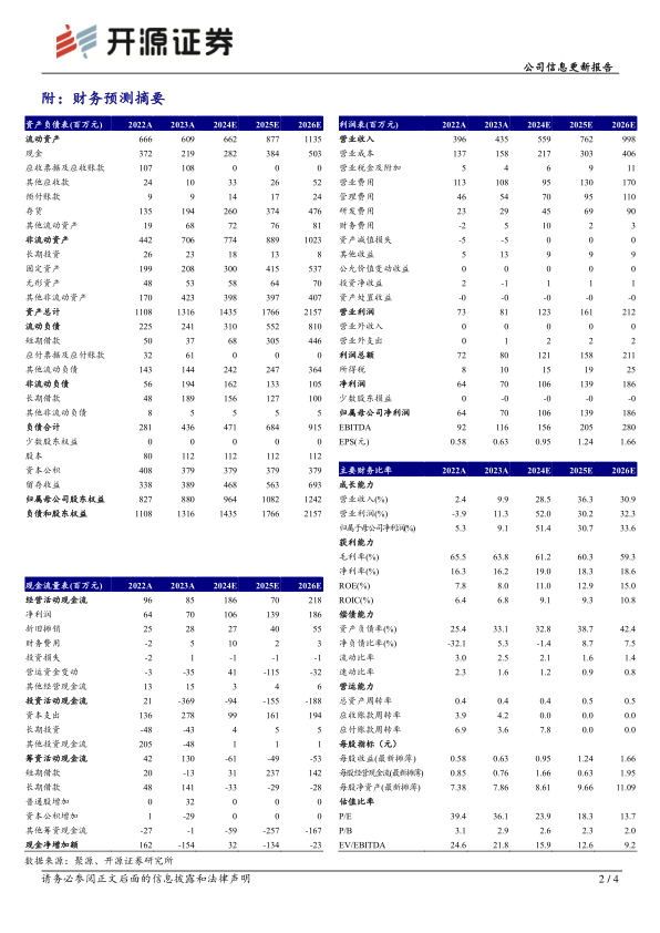 鉴于研发投入的增加以及CDMO早期项目竞争的加剧,开源证券下调了圣诺生物2024-2026年的盈利预测。预计2024-2026年归母净利润分别为1.06亿元、1.39亿元和1.86亿元(原预测为1.41亿元、1.76亿元和2.11亿元),对应的EPS分别为0.95元、1.24元和1.66元。当前股价对应的PE分别为23.9倍、18.3倍和13.7倍。尽管盈利预测有所下调,但分析师维持了“买入”评级,主要基于公司新产能即将落地,预计将推动原料药业务进入快速发展期,从而打开长期成长空间。