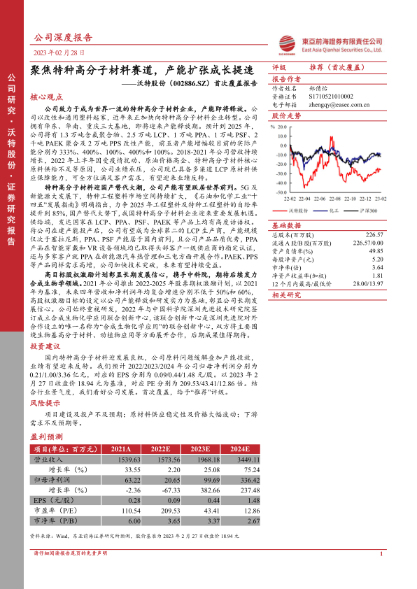 国内特种高分子材料迎发展良机,公司原料问题缓解叠加产能投放,业绩有望迎来反转。我们预计2022/2023/2024年公司归母净利润分别为0.21/1.00/3.36亿元,对应的EPS分别为0.09/0.44/1.48元/股。以2023年2月27日收盘价18.94元为基准,对应PE分别为209.53/43.41/12.86倍。结合行业景气度,我们看好公司发展。首次覆盖,给予“推荐”评级。