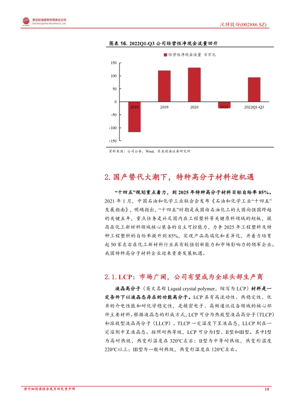 特种高分子材料迎国产替代大潮,公司产能有望跃居世界前列。5G及新能源大发展下,特种工程塑料市场空间持续扩大,《石油和化学工业“十四五”发展指南》明确指出,力争2025年工程塑料及特种工程塑料的自给率提升到85%,国产替代大势下,我国特种高分子材料企业迎来重要发展机遇。供给端,发达国家在LCP、PPA、PSF、PAEK等产品上均有高度话语权。待公司在建产能投产后,公司有望成为全球第二的LCP生产商,产能规模仅次于塞拉尼斯,PPA、PSF产能居于国内前列,且公司产品品质优秀,PPA产品在智能穿戴和VR设备领域均已取得头部客户一级供应商的指定认证,还与多家客户就PPA在新能源汽车热管理和三电方面开展合作。PAEK、PPS等产品同样需求高增,公司加快技术突破,未来有望持续受益。